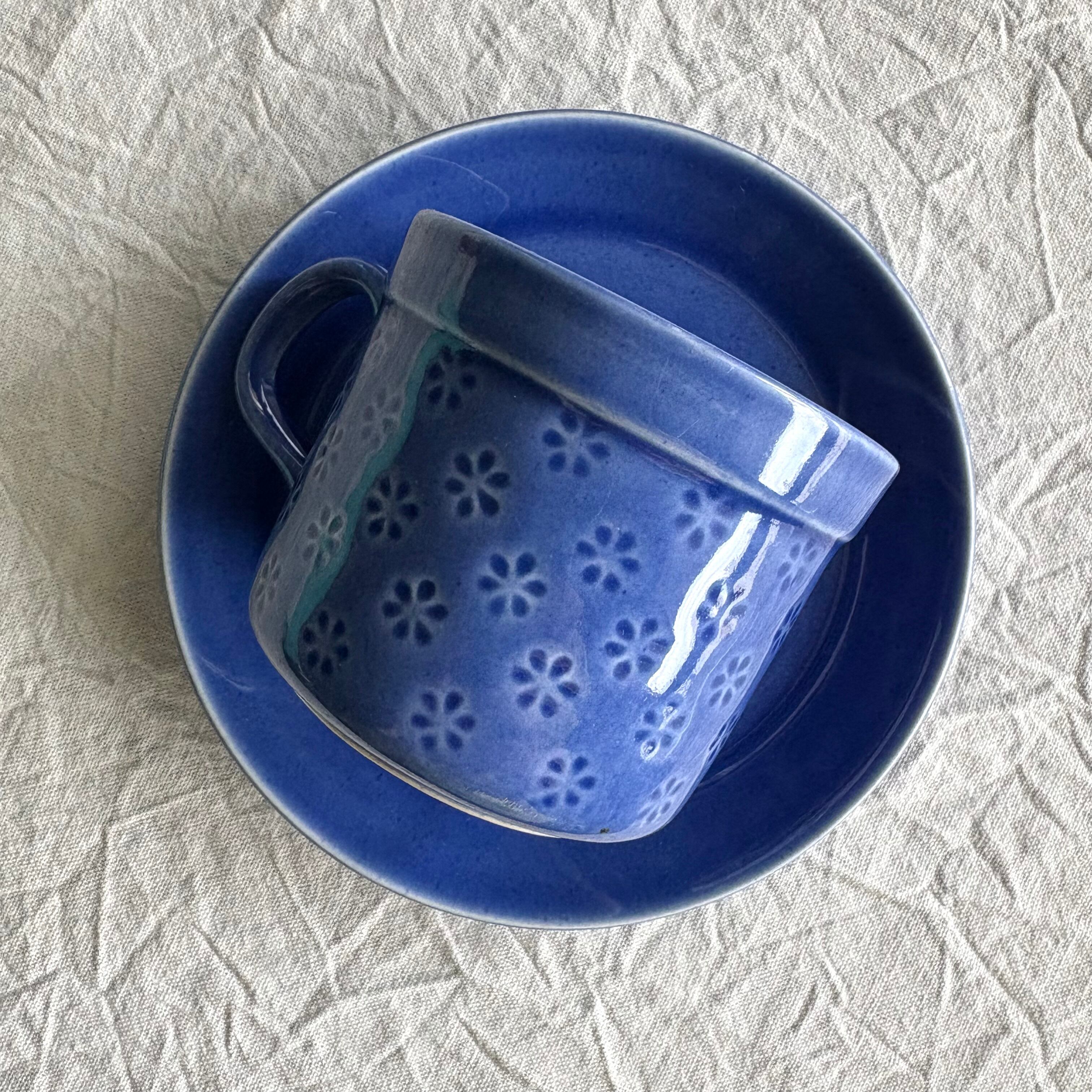 青の釉薬がカップのお花の部分に入り込み、そこが濃い色味になっていて青の濃淡で模様を表しています。少し紫が混ざったようなブルー、小ぶりなサイズ感も愛らしく、飾っておくだけでも絵になります
