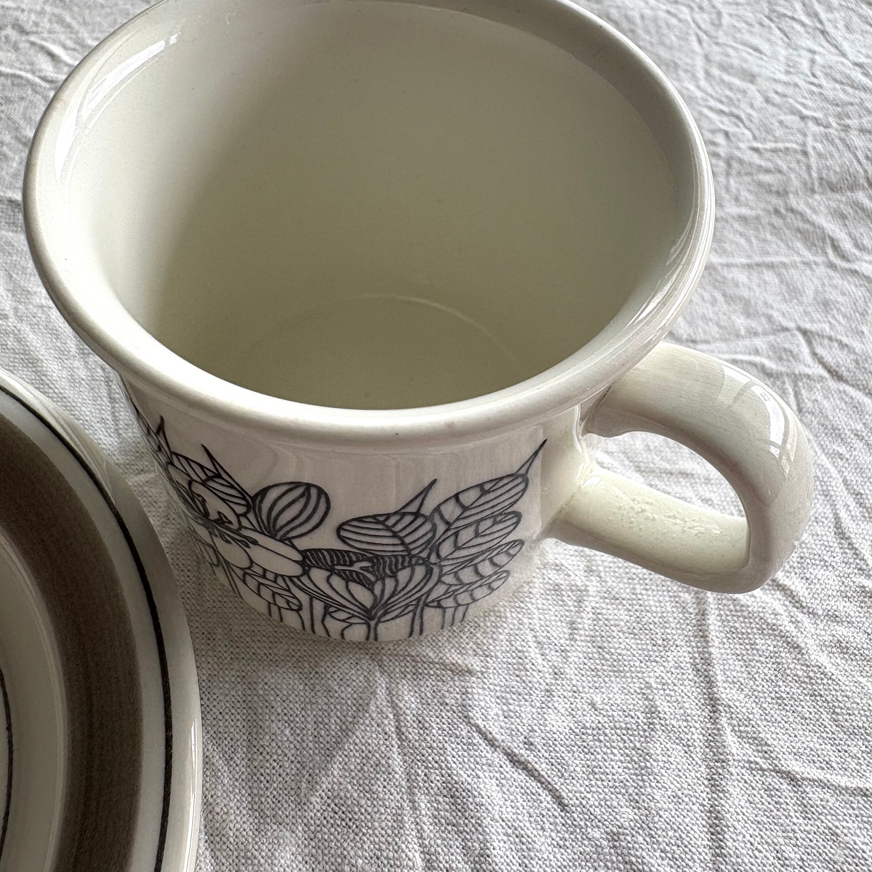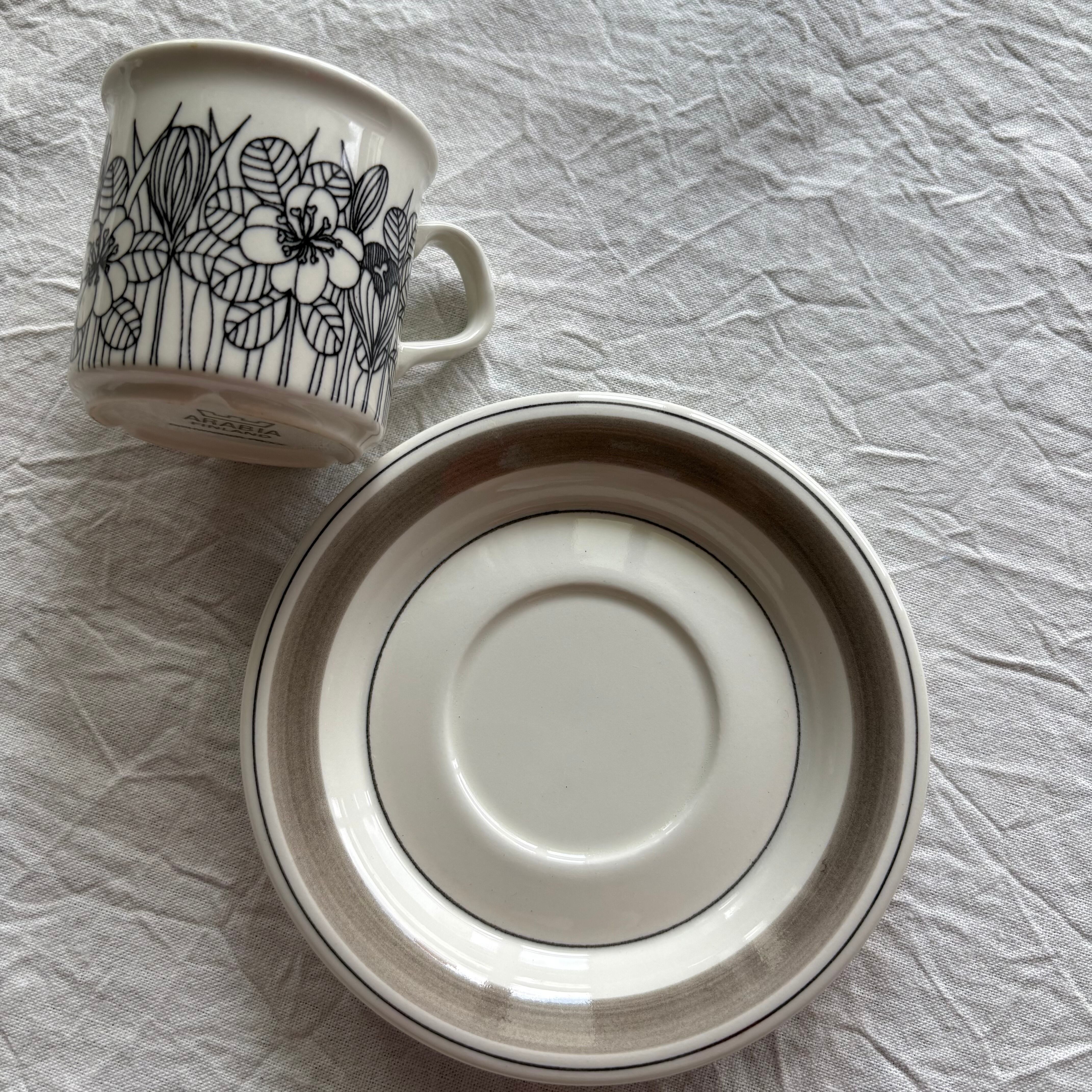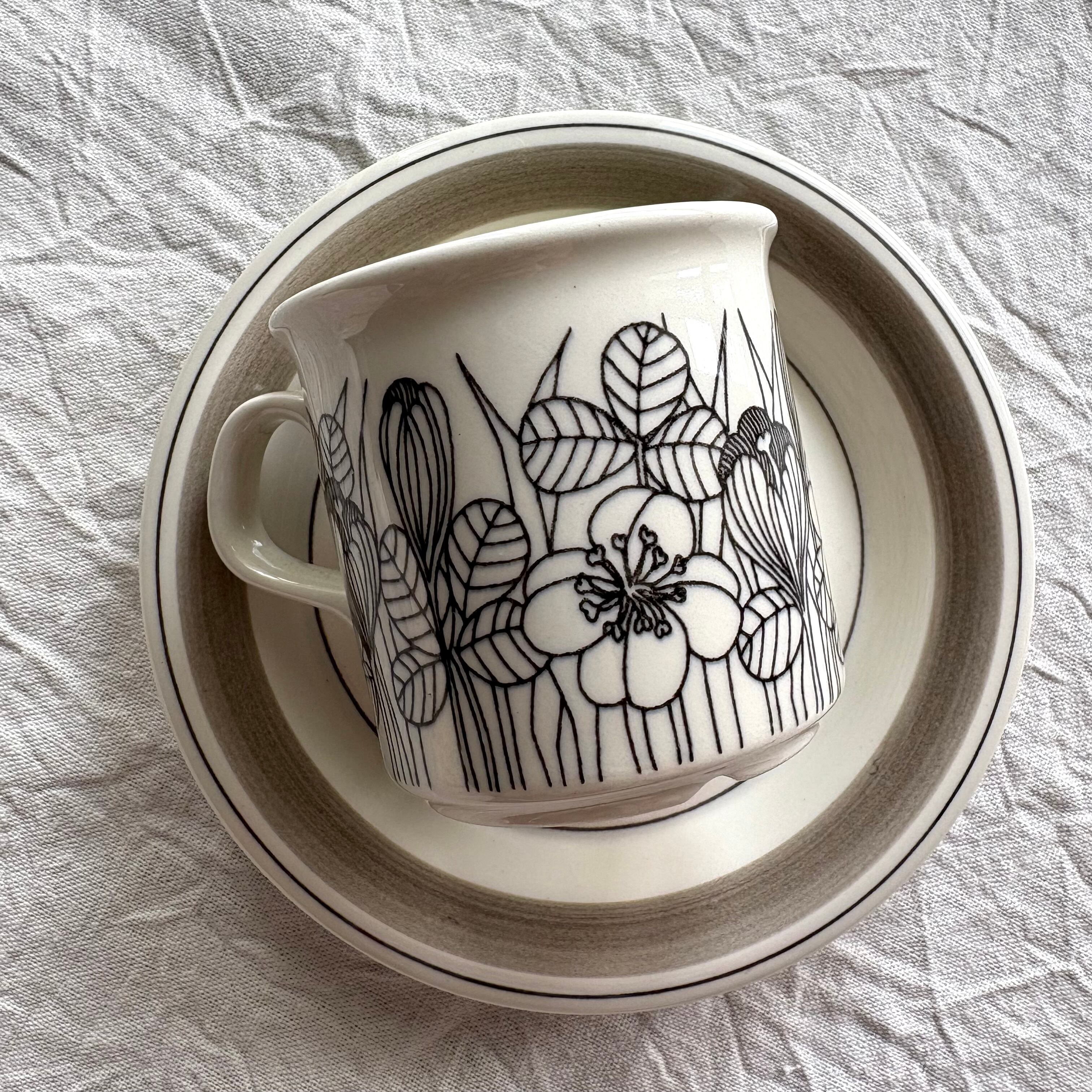 そんなクロッカスのお花とクローバーの葉が描かれた大人気のクロッカスシリーズ。デコレートデザインは花柄のデザインで有名なエステリ・トムラ/Esteri Tomulaです。大変人気のデザインのため、復刻版が出ていますが、こちらはヴィンテージのものです。1978-79年の2年間しか製造されなかったという希少なカップ&ソーサー。カラーとモノクロシリーズがあり、どちらも人気ですが、今回はさらにレアなグレーの縁取りのグレーリムデザインです。淡いグレーが花柄をスタイリッシュに仕上げています