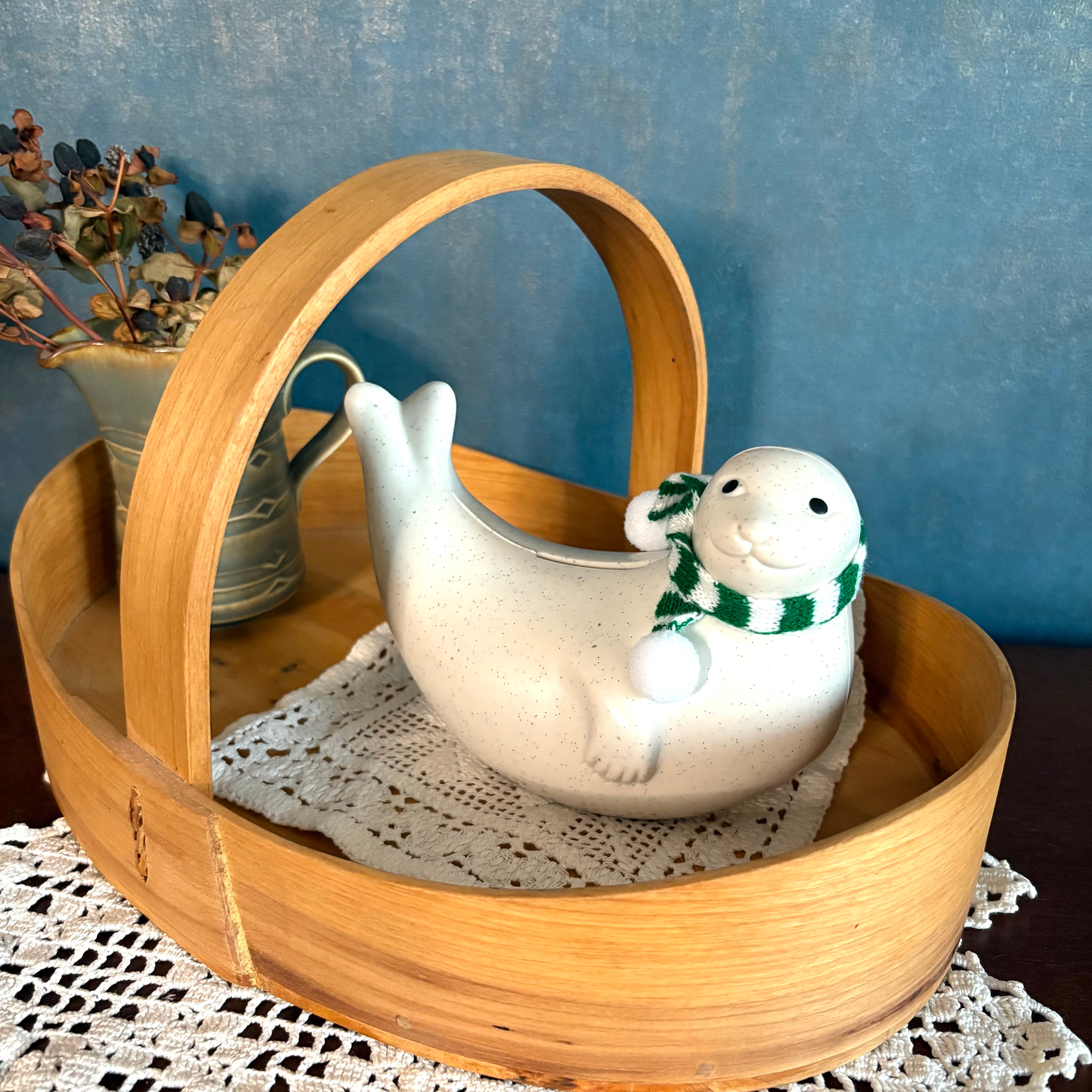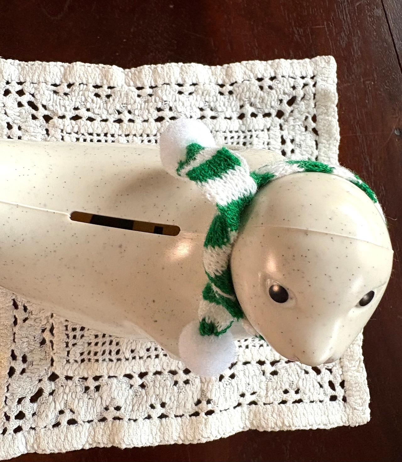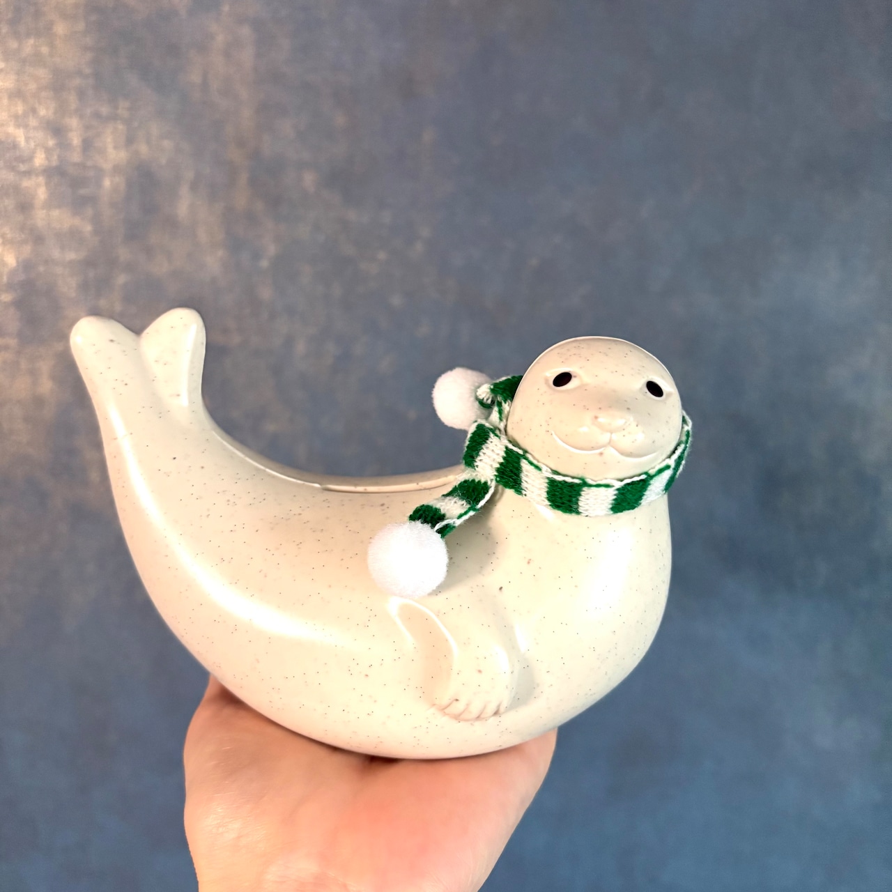 フィンランドよりアザラシの貯金箱がやってきました。なんと可愛いマフラーを巻いています。このマフラーの色は2025年限定のもの。マフラーの先にはこれまた可愛いぽんぽんがついています⁎༶✧✻