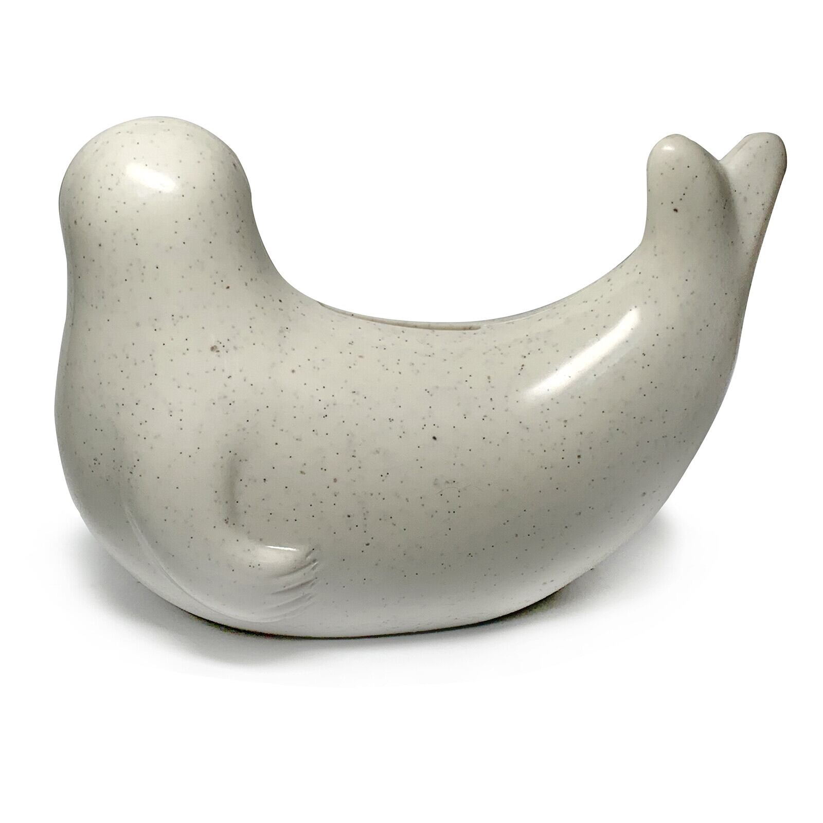 デザインはアラビアアートデパートメントで活躍したGunvor Olin-Gronqvist. このアザラシ貯金箱のモチーフになっているのは、Saimaannorppa サイマーンノルッパ(サイマーワモンアザラシ)。フィンランドのサイマー湖にしか生息しておらず、現在の固体数が350から400ほどの世界一希少なアザラシ。WWFの絶滅危惧種に指定されています