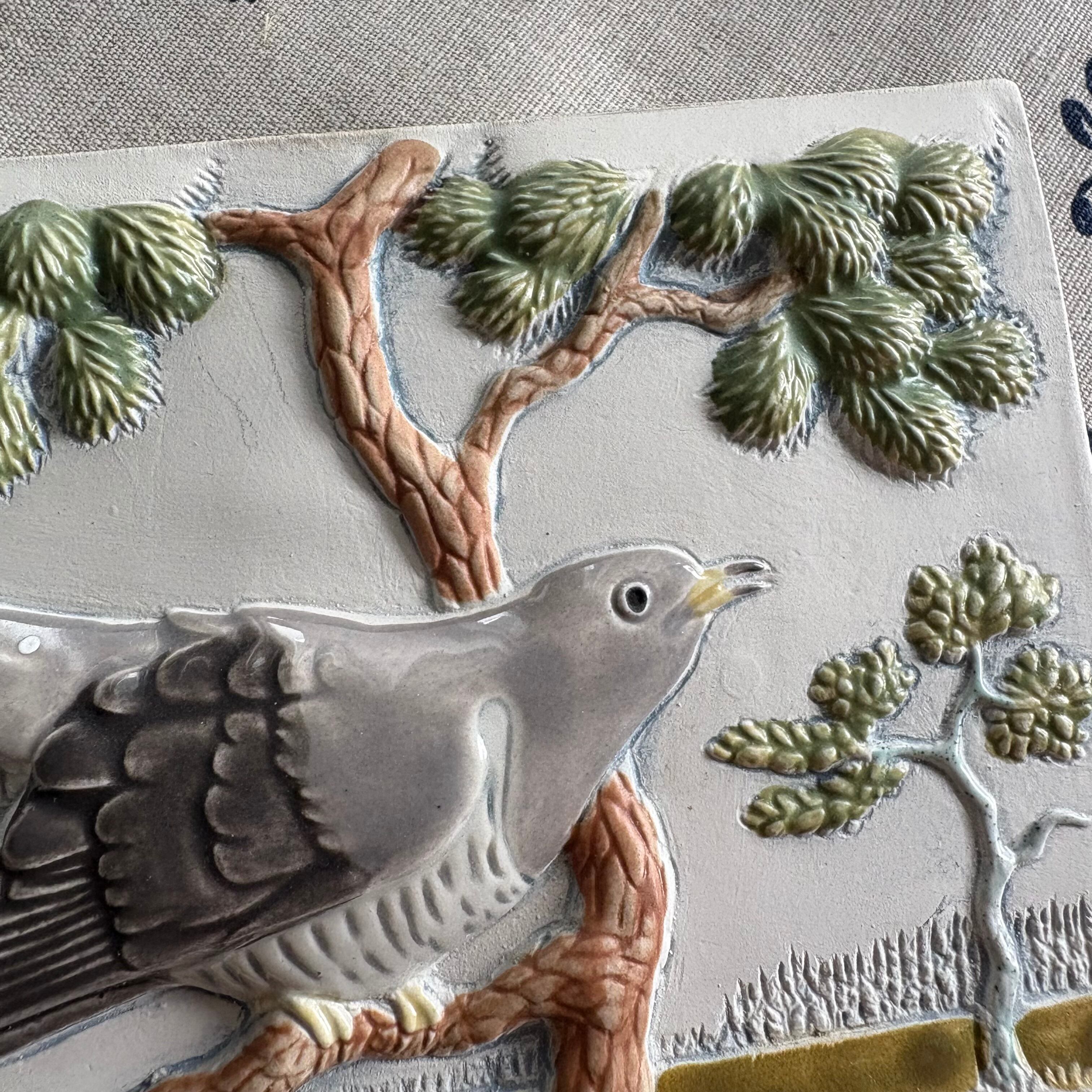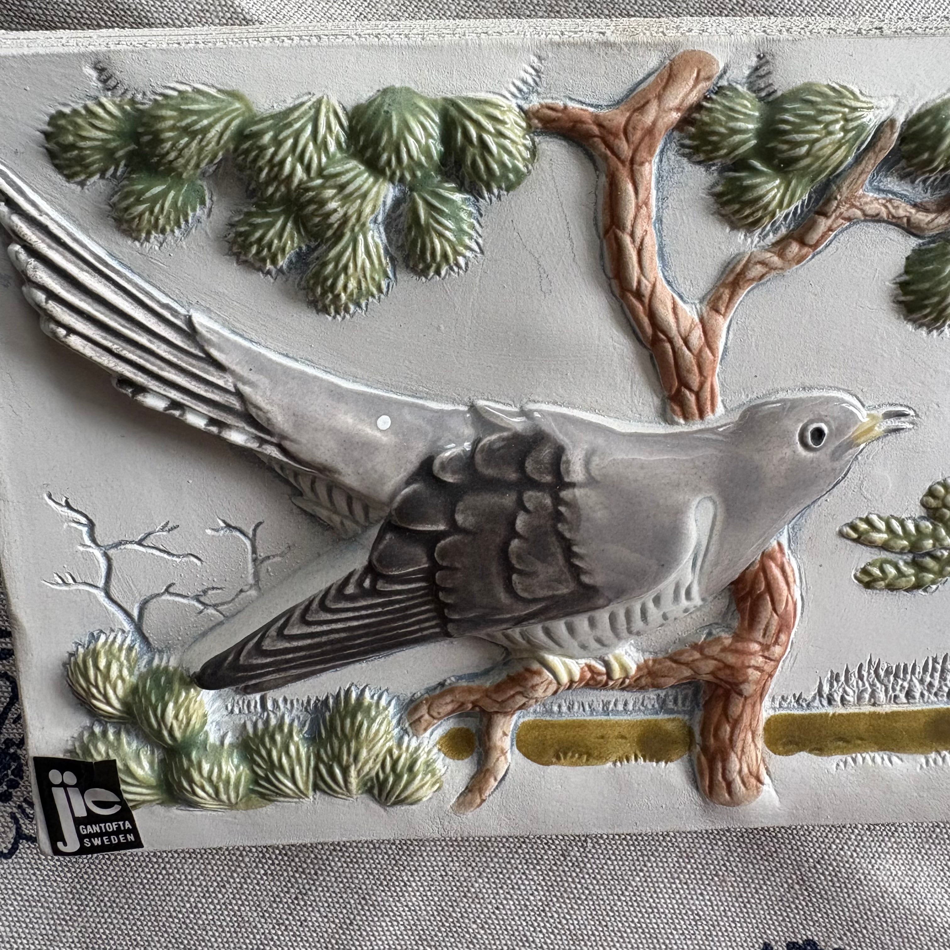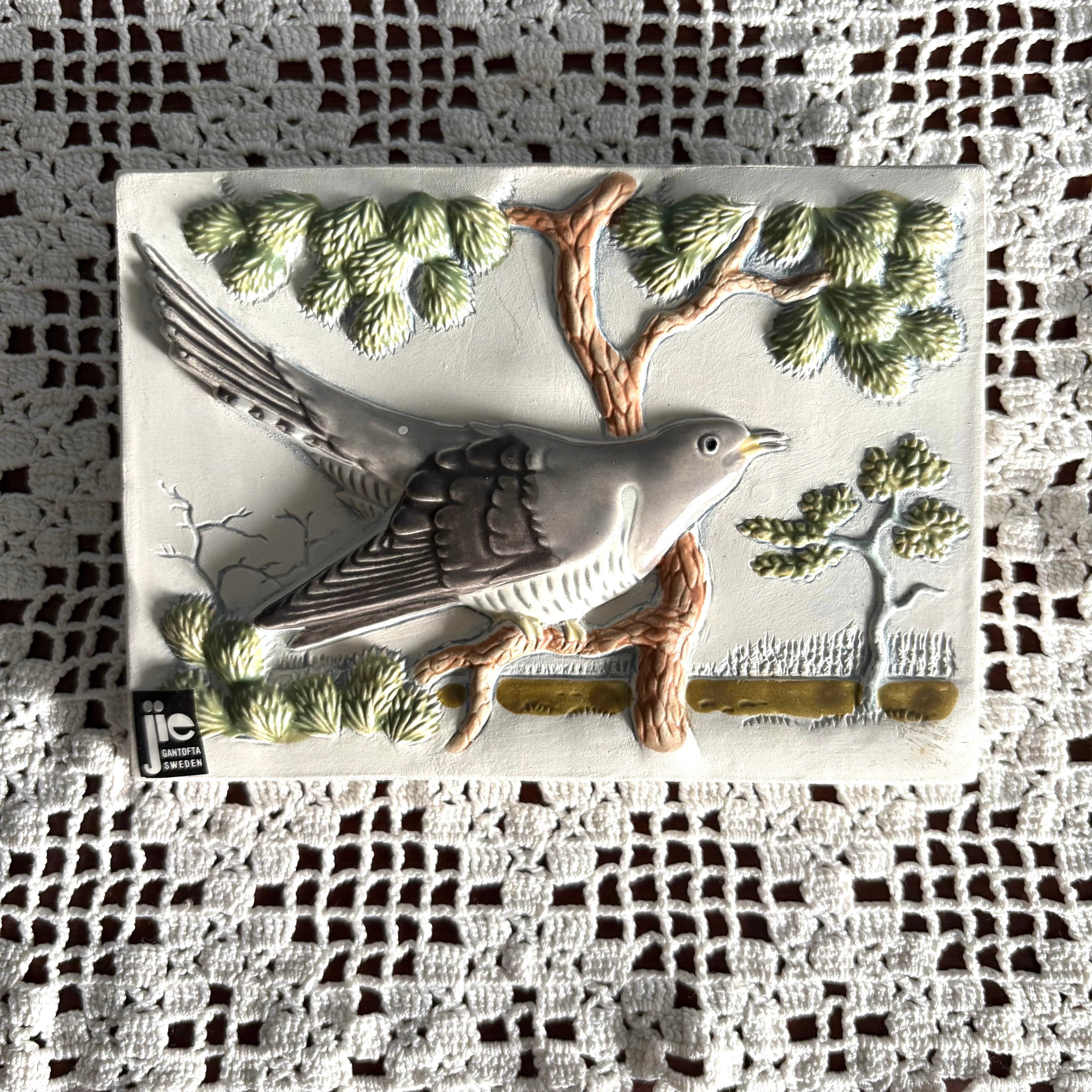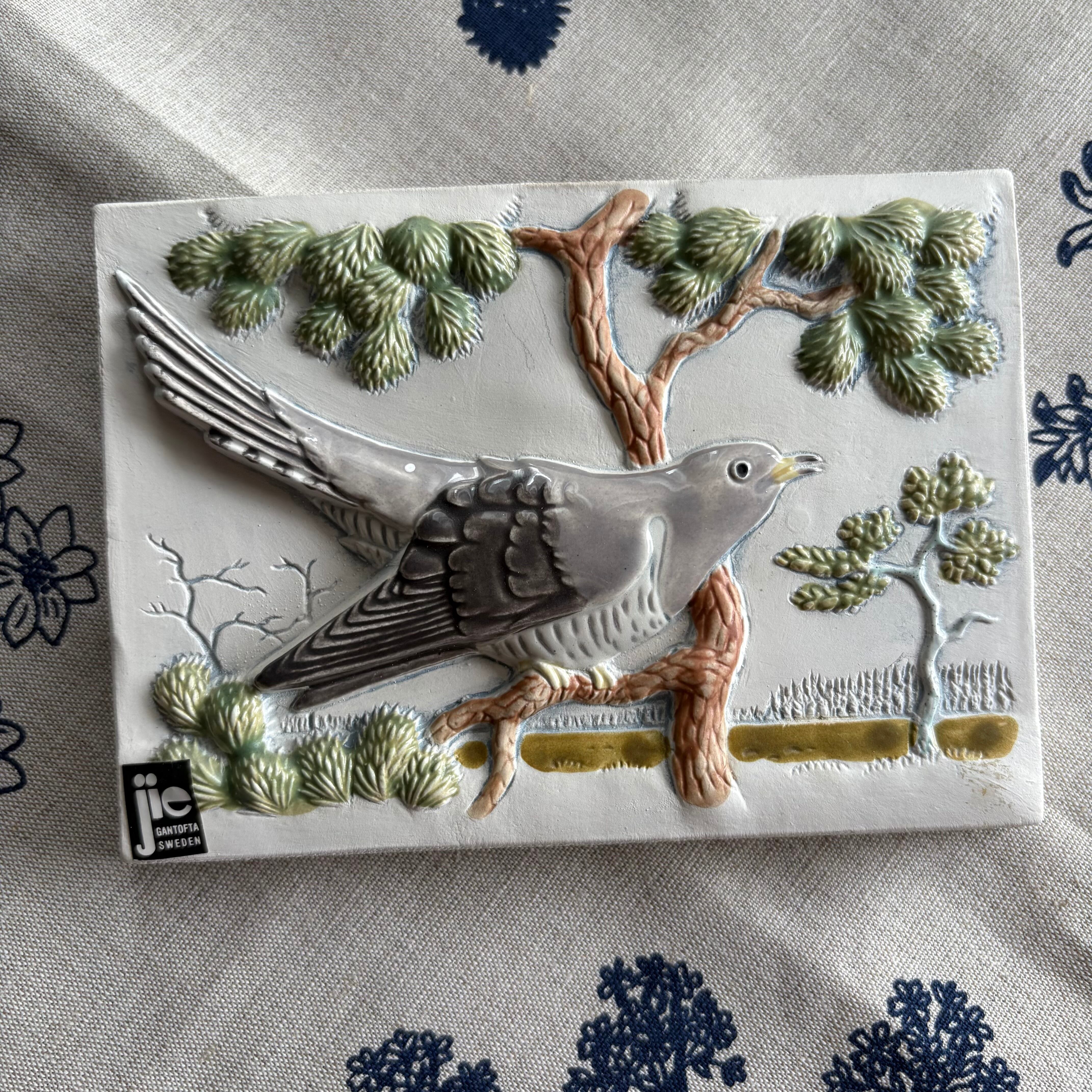 1940年創業のスウェーデンのJie Gantofta社の陶板。スウェーデンの西の方にあるヴェルムランド地方の風景がデザインされています。木にとまってひと休みしているこちらの鳥さんはかっこう。スウェーデンの雄大な自然を眺めています❀⁎༶