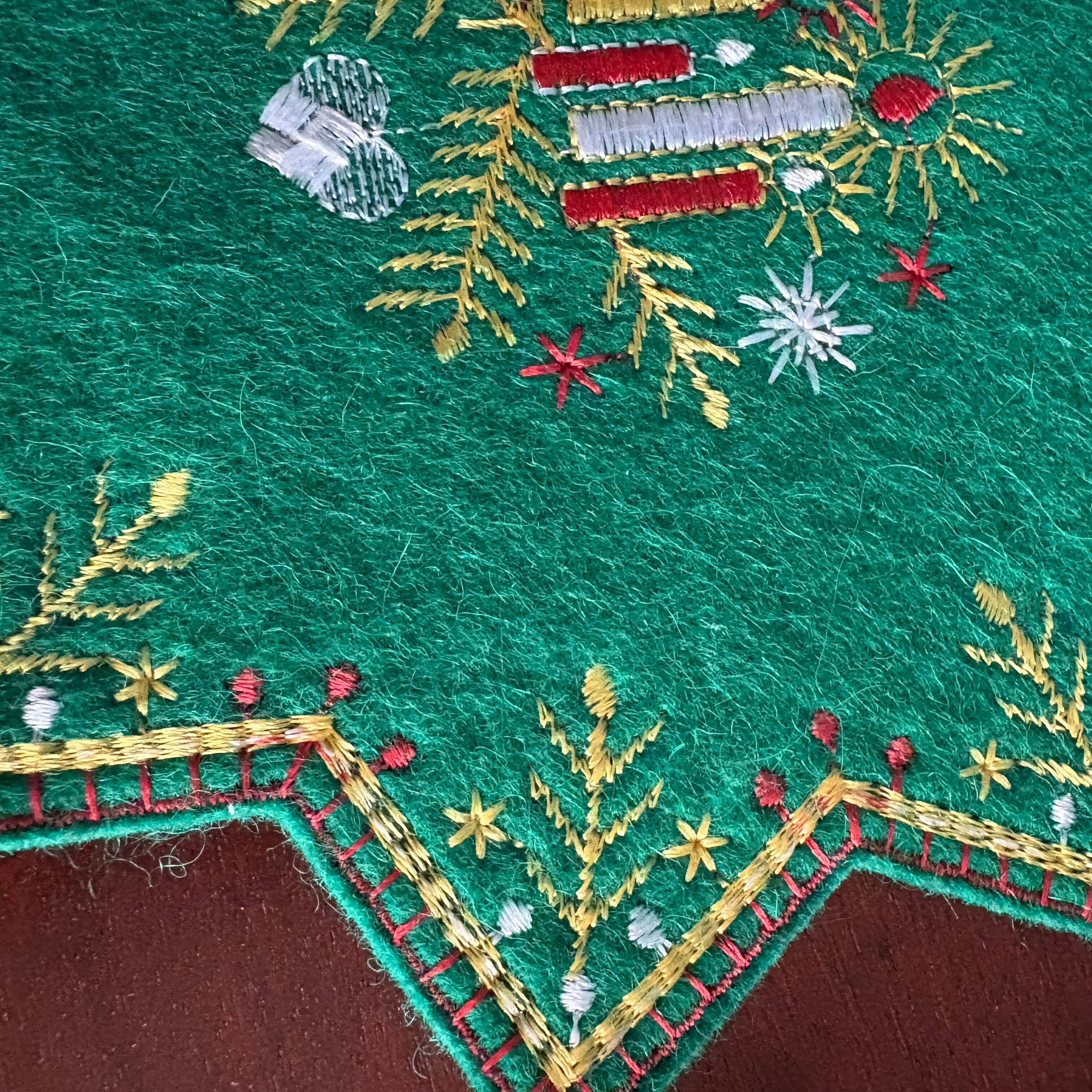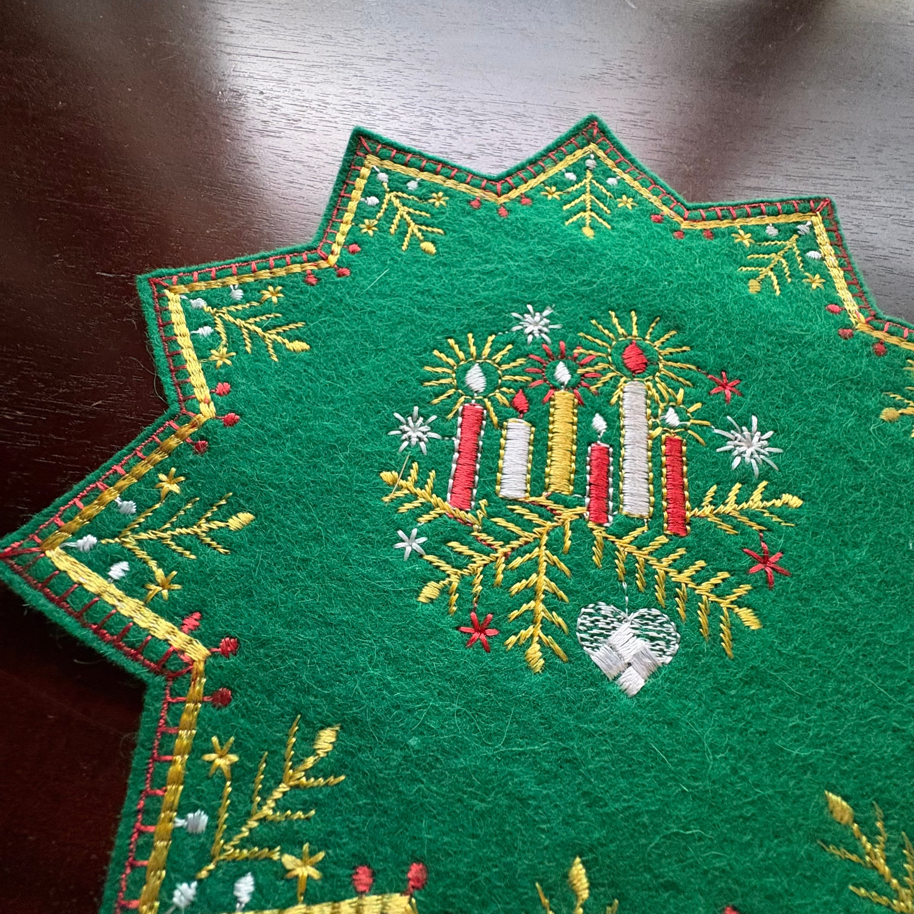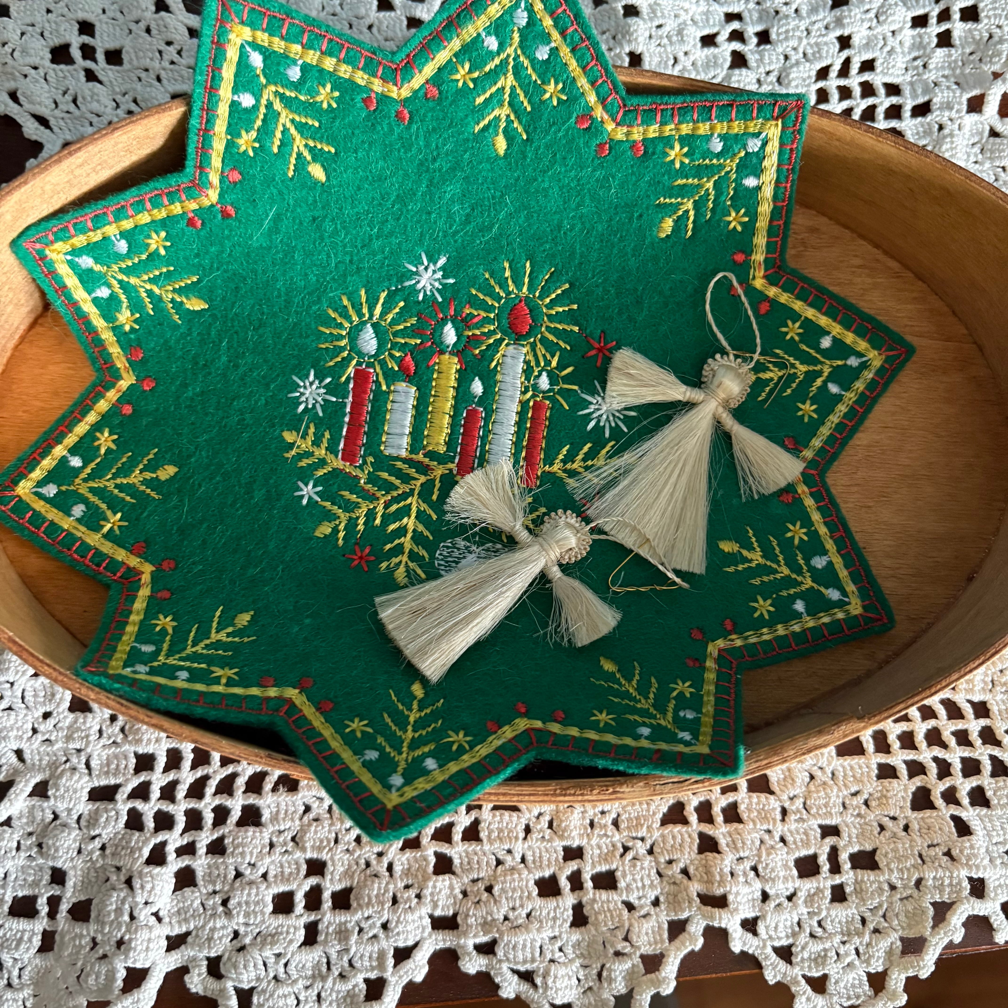 グリーンのヴィンテージのクロスはフェルト生地で、キャンドルが真ん中に刺繍されています。まわりには小さい実とツリーの模様。小さめでオブジェやキャンドルの下にそっと敷くのによいサイズ
