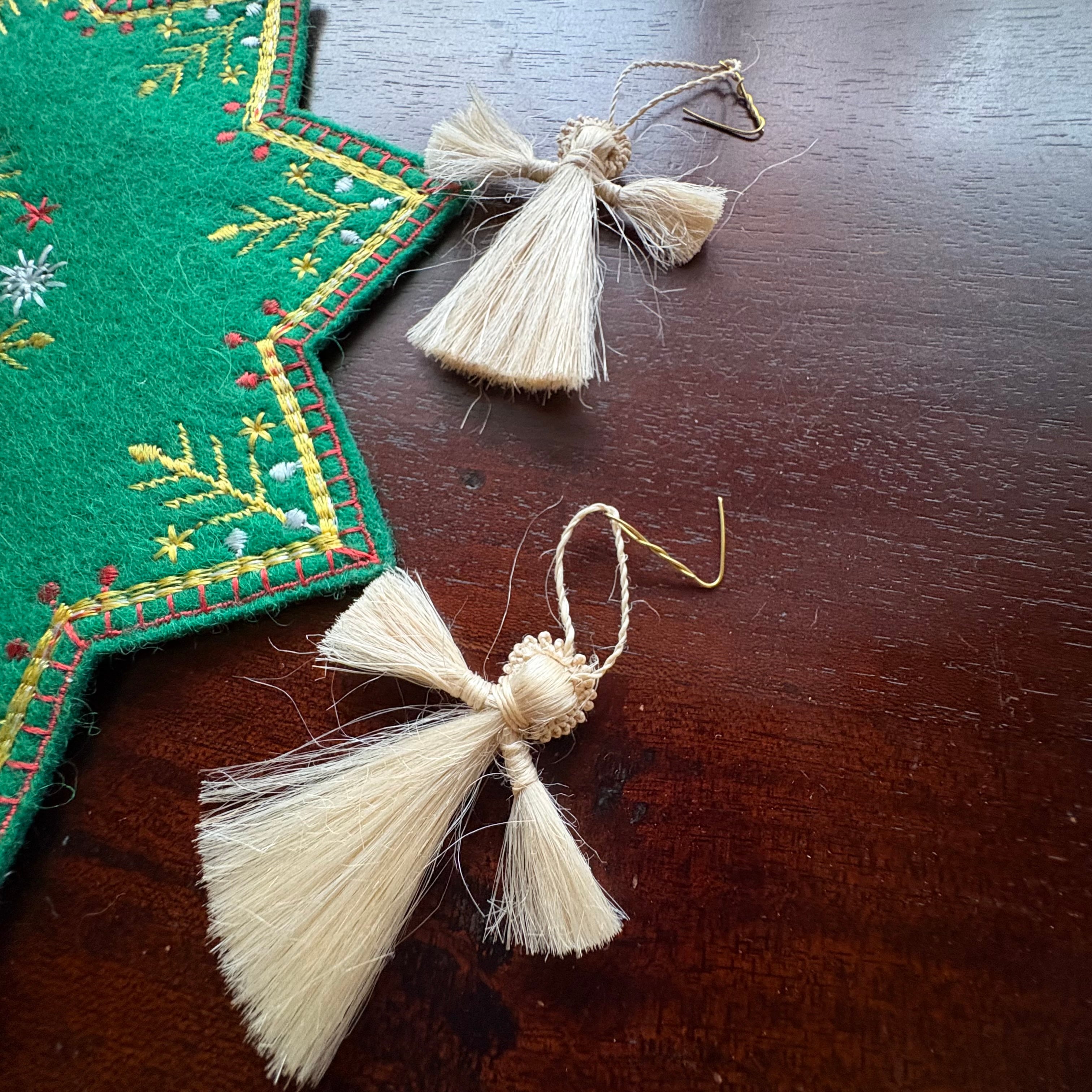 そして最近ではなかなか見つからなくなってきました、ヴィンテージリネンの天使のオーナメントを2つ。ツリーに吊るしてもちょこんと飾っても可愛いです。編み込んだ髪とふさふさしたフォルムが癒してくれます