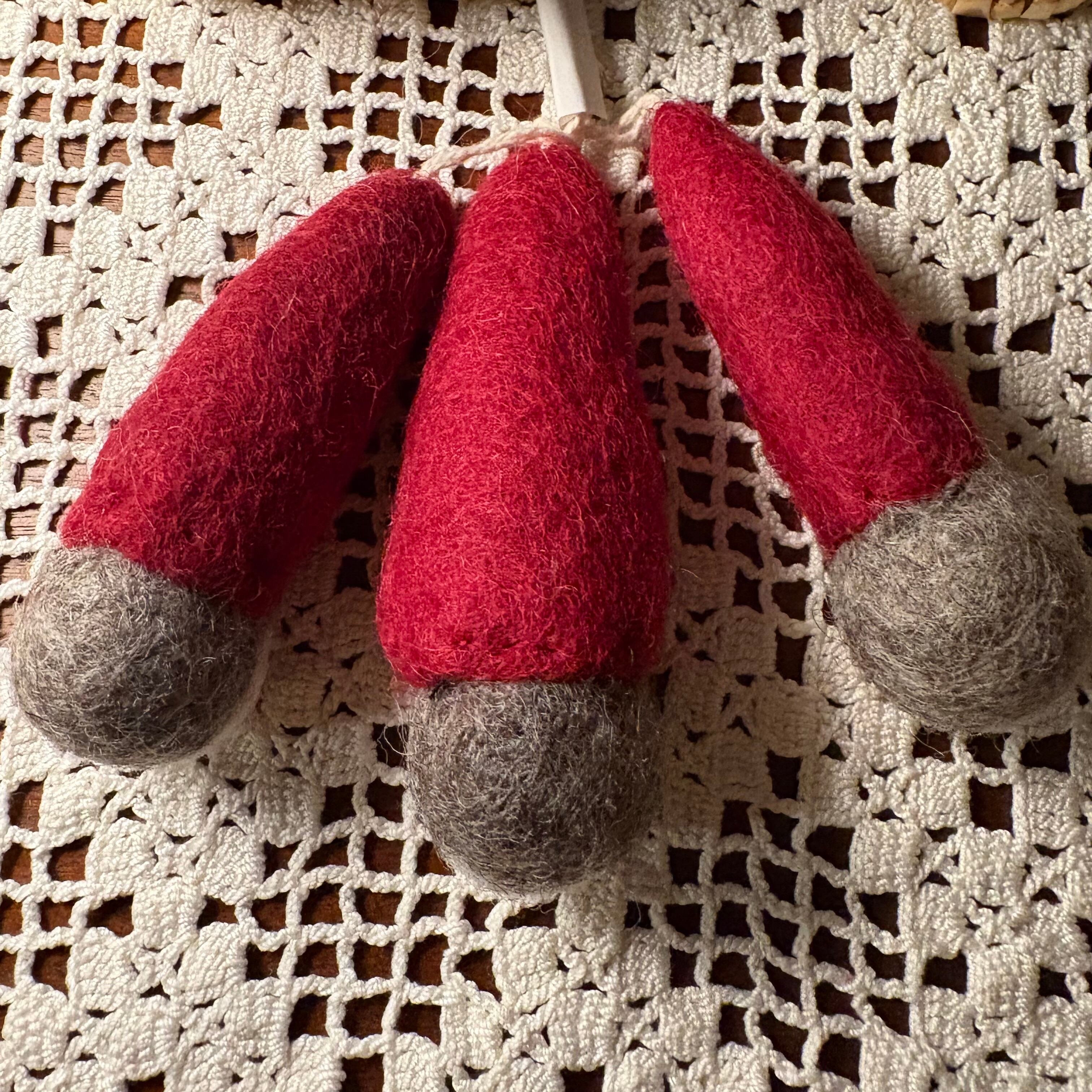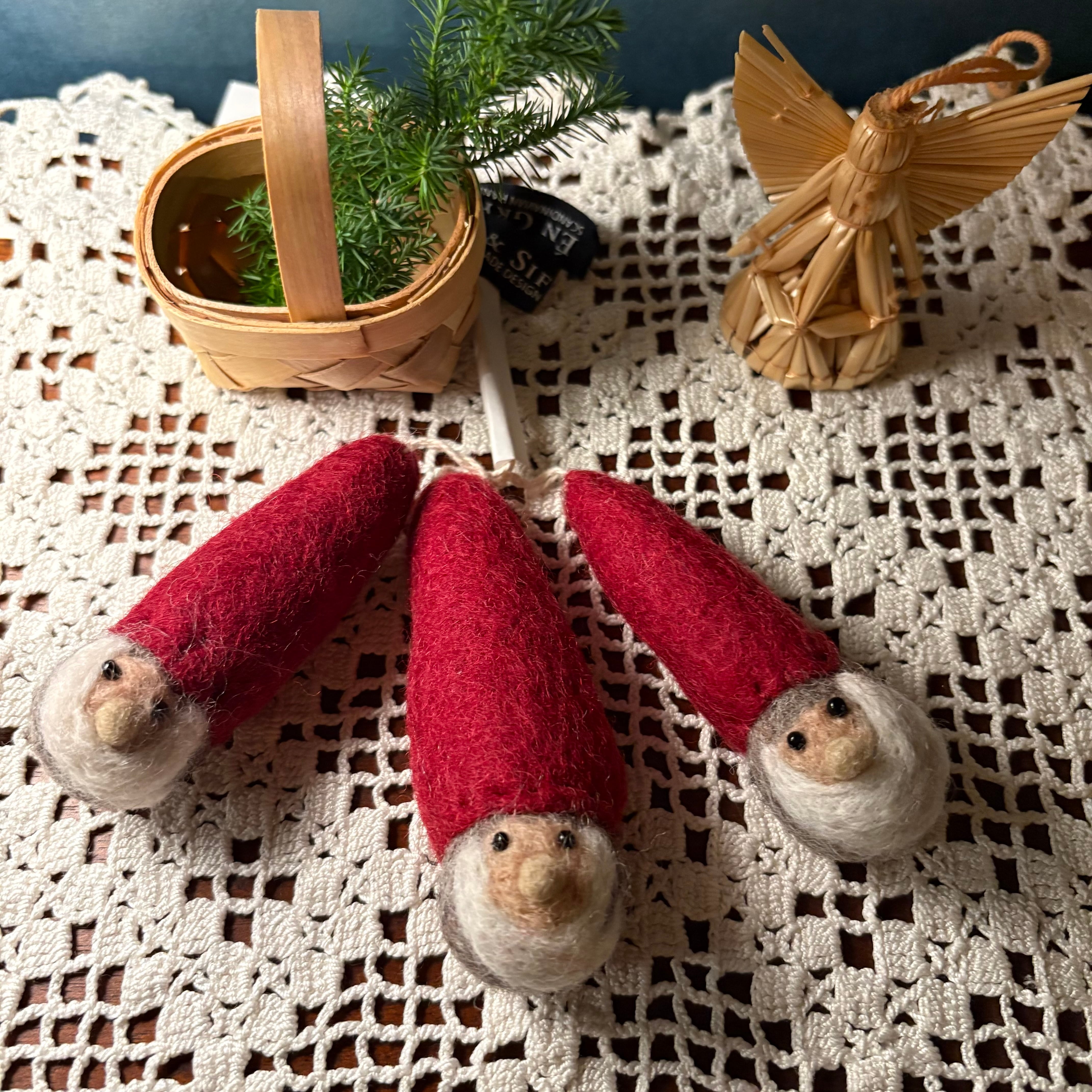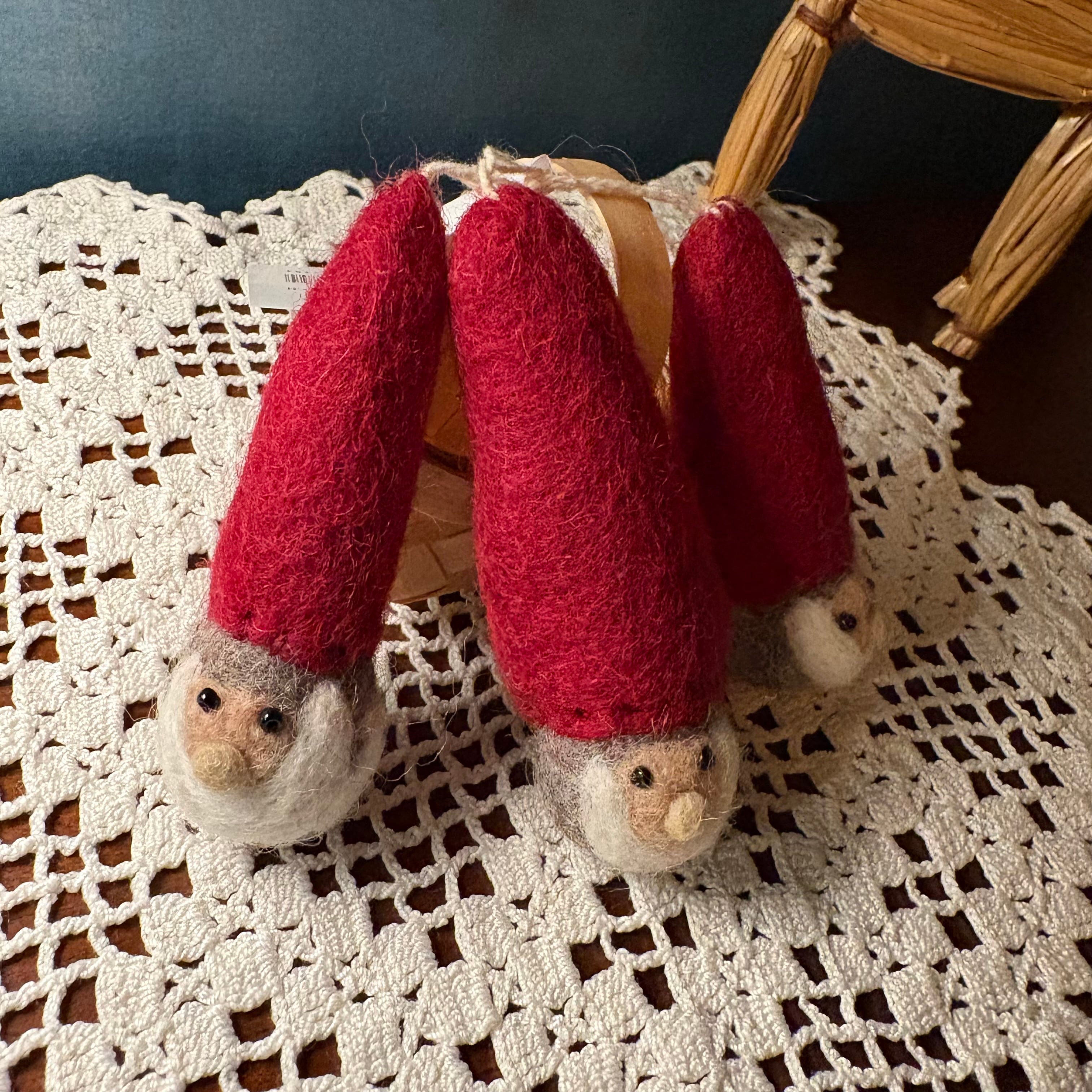 とんがり帽子が可愛い3人のノーム。手作りなのでちょっとずつお顔が違いますね。お送りするときは3人まとまっていますが、バラバラに吊るすことができます