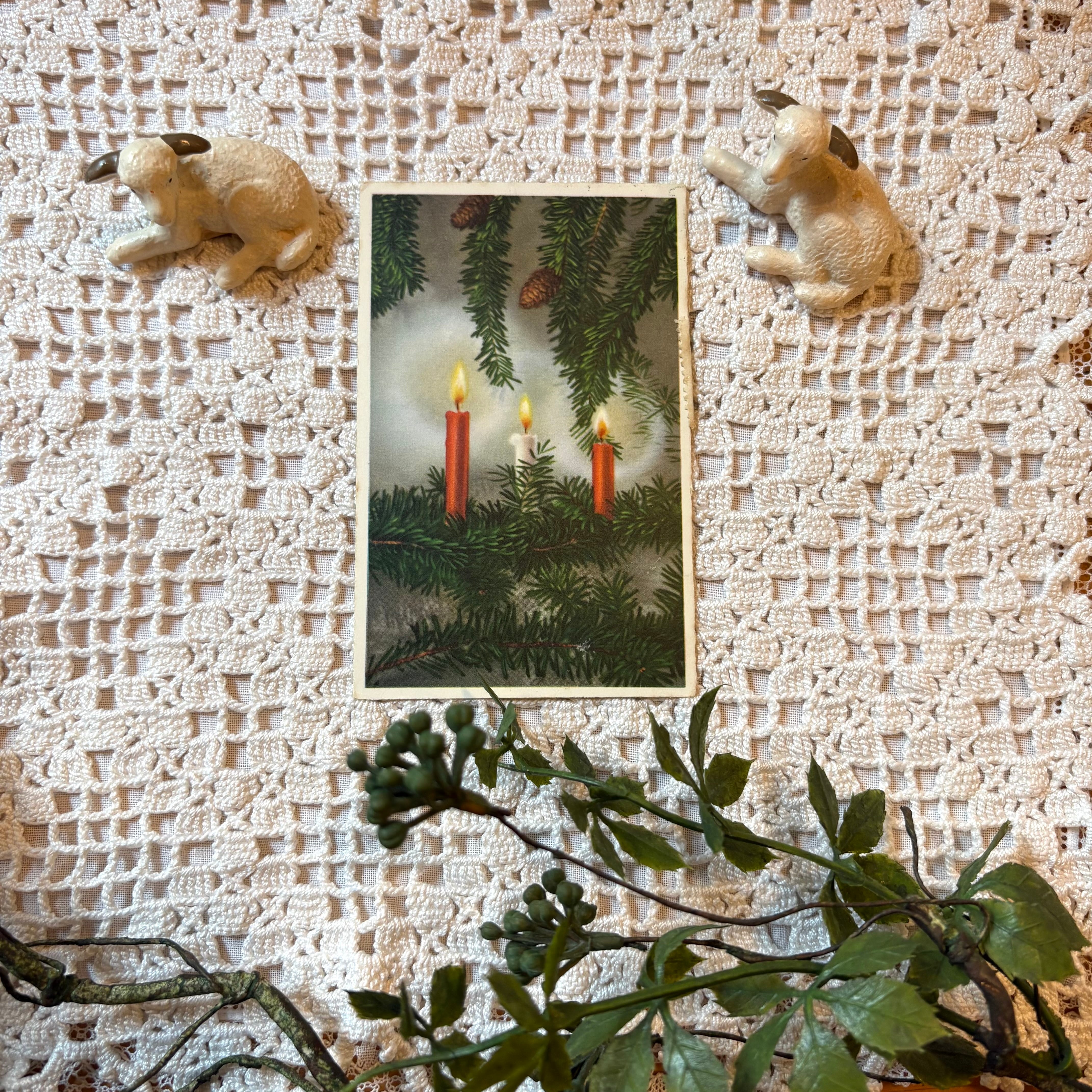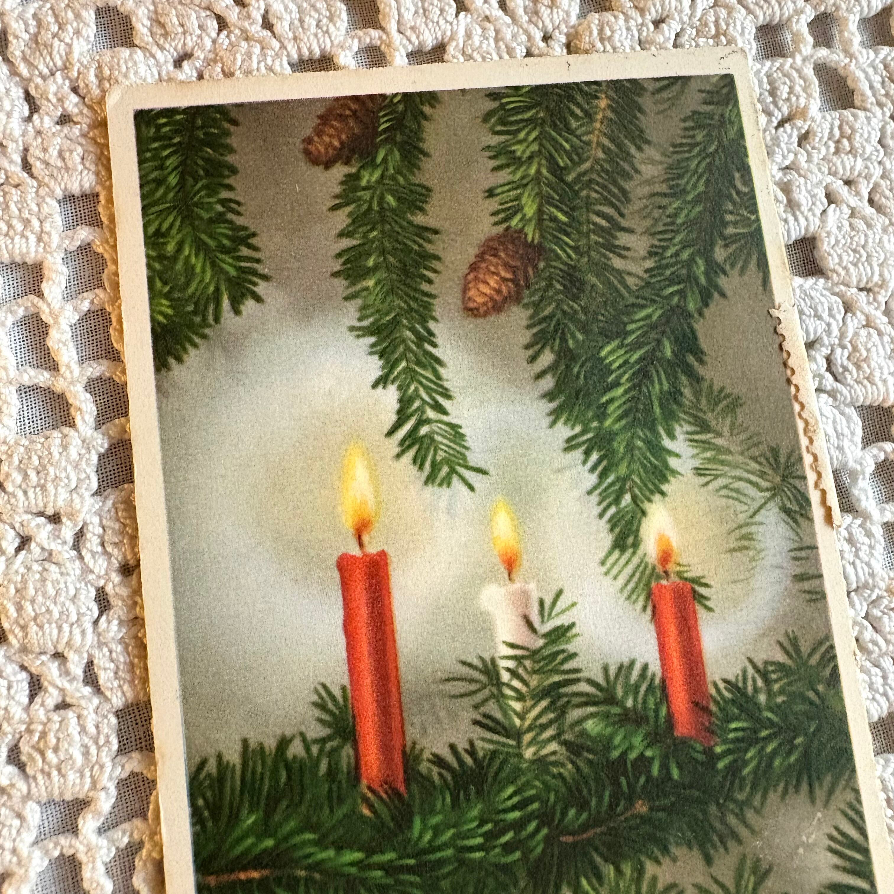 3つのキャンドルが静かに灯っています。静かなクリスマスの絵です。1950年代の作品と思われます⁎༶