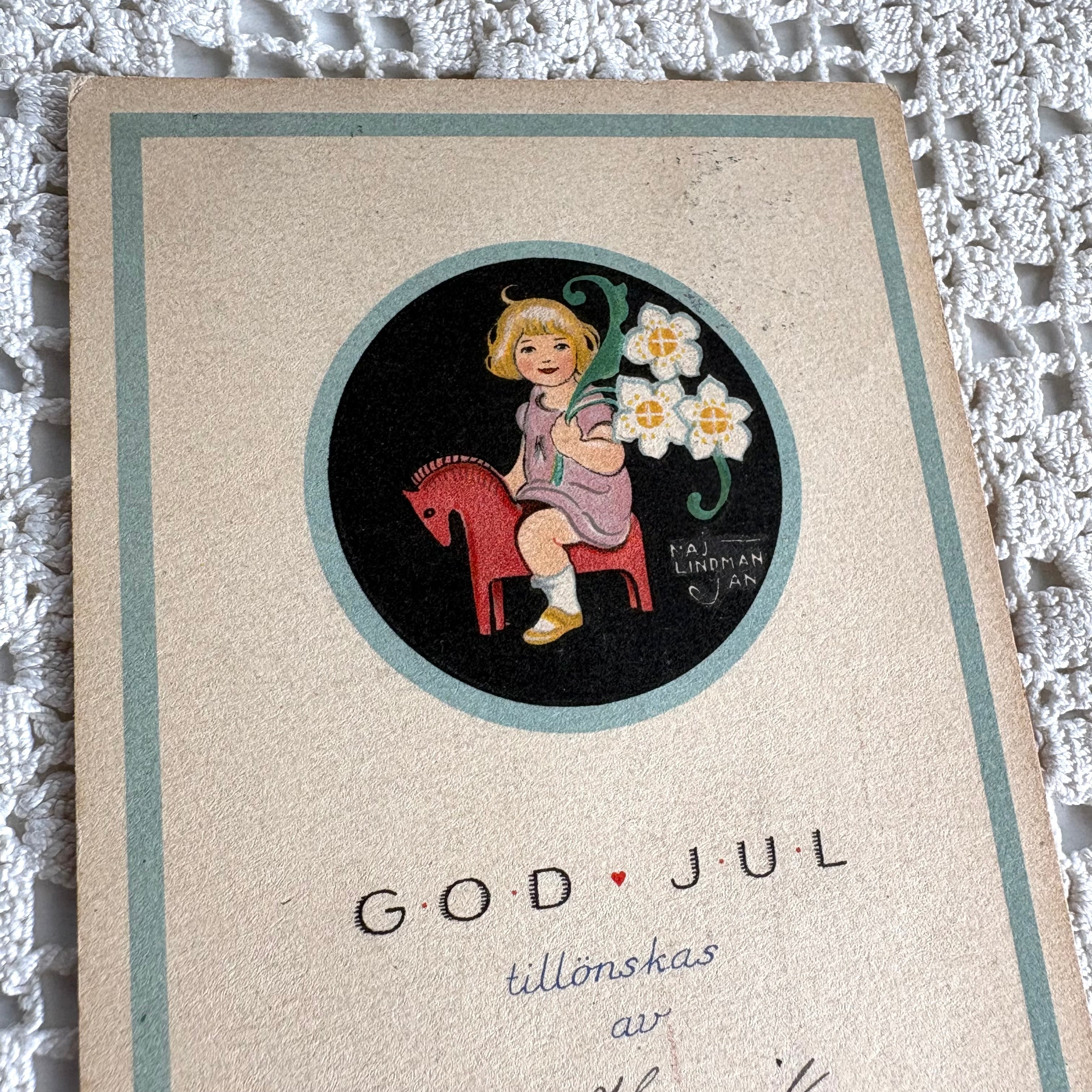 赤い木馬にまたがる女の子。水仙を手にしていてちょっと微笑んでいる姿がほほえましいです。カードには”GOD JUL ヘンリックの息子、神のご加護を”と書かれています。離れて暮らすご家族へのクリスマスカードだったのかもしれません❀⁎༶