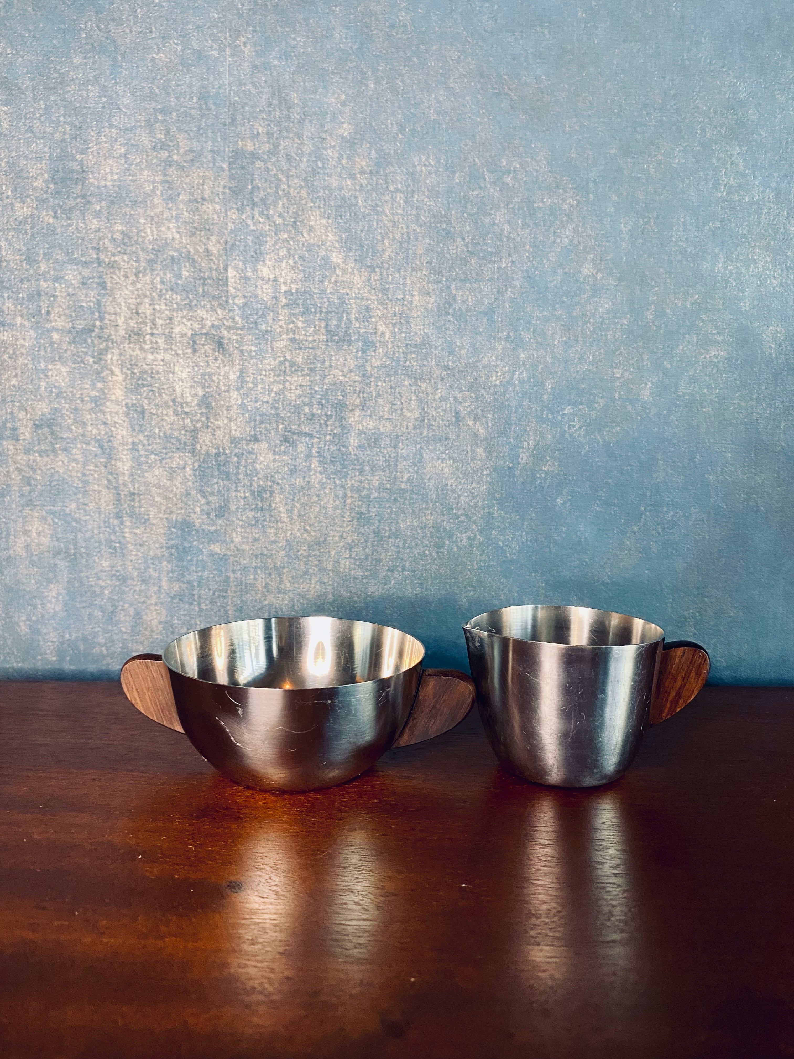 Denmark vintage⋆༶⠜チークのハンドルがついたステンレスのクリーマーとシュガーボウル
