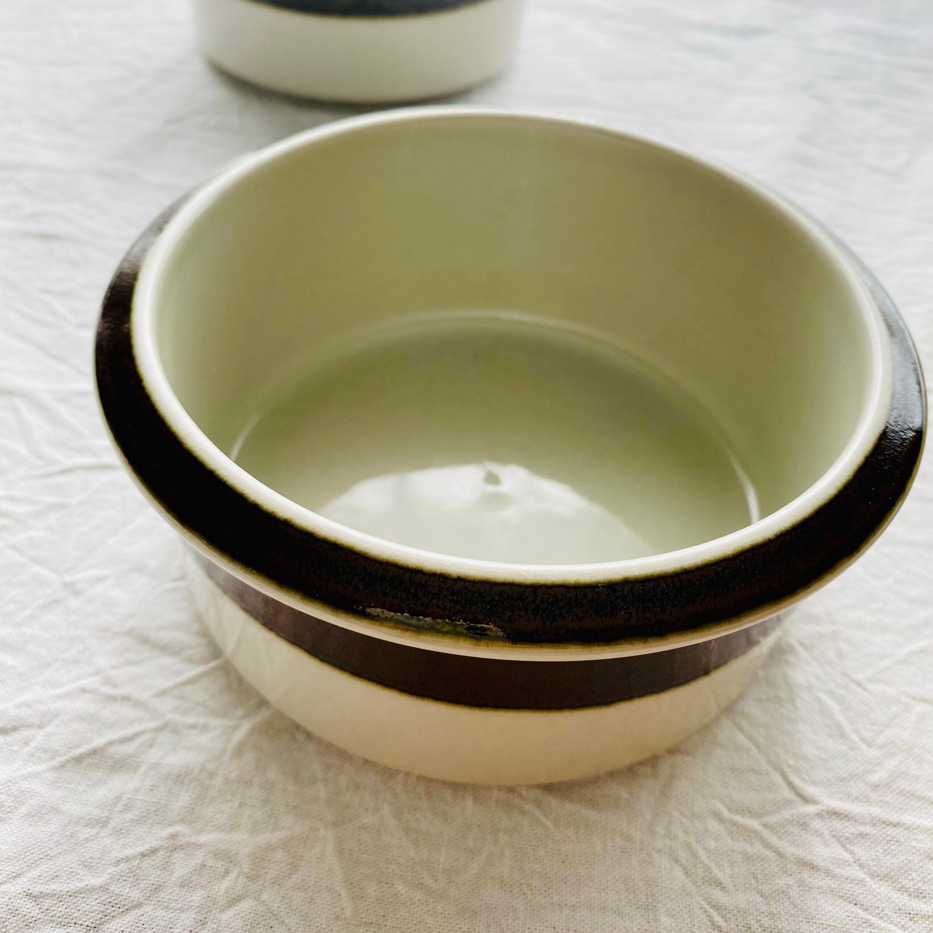 シンプルなブラウンのラインが特徴のカレリアシリーズ。ライン部分の釉薬がにじんだような淵どりになっています。ラインの色合いもそれぞれ。飽きのこないデザインで長く使えます。