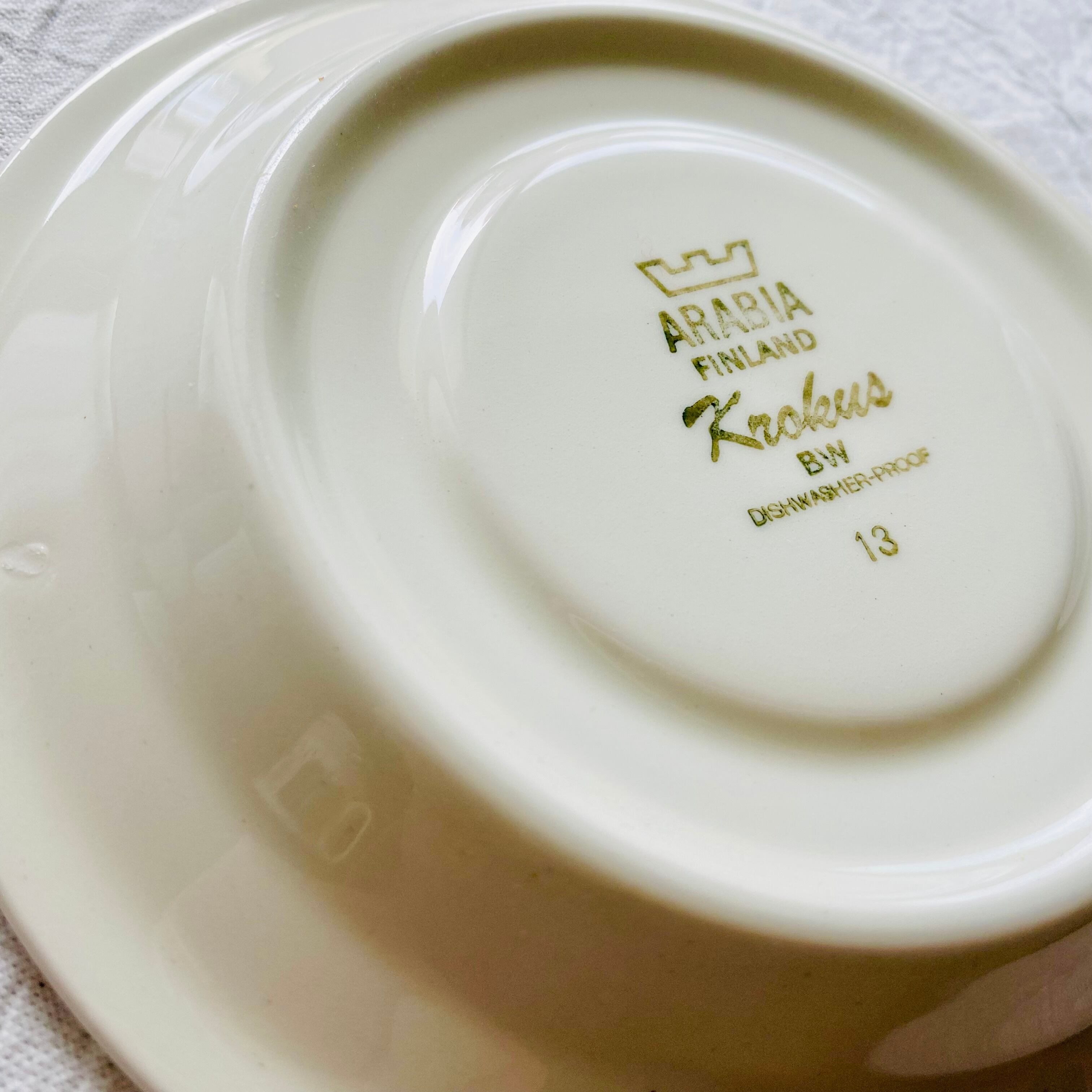 そんなクロッカスのお花とクローバーの葉が描かれた大人気のクロッカスシリーズ。デザインは花柄のデザインで有名なエステリ・トムラ/Esteri Tomulaです。大変人気のデザインのため、復刻版が出ていますが、こちらはヴィンテージのものです。1978-79年の2年間しか製造されなかったという希少なカップ&ソーサー。カラーとモノクロシリーズがあり、どちらも人気です。