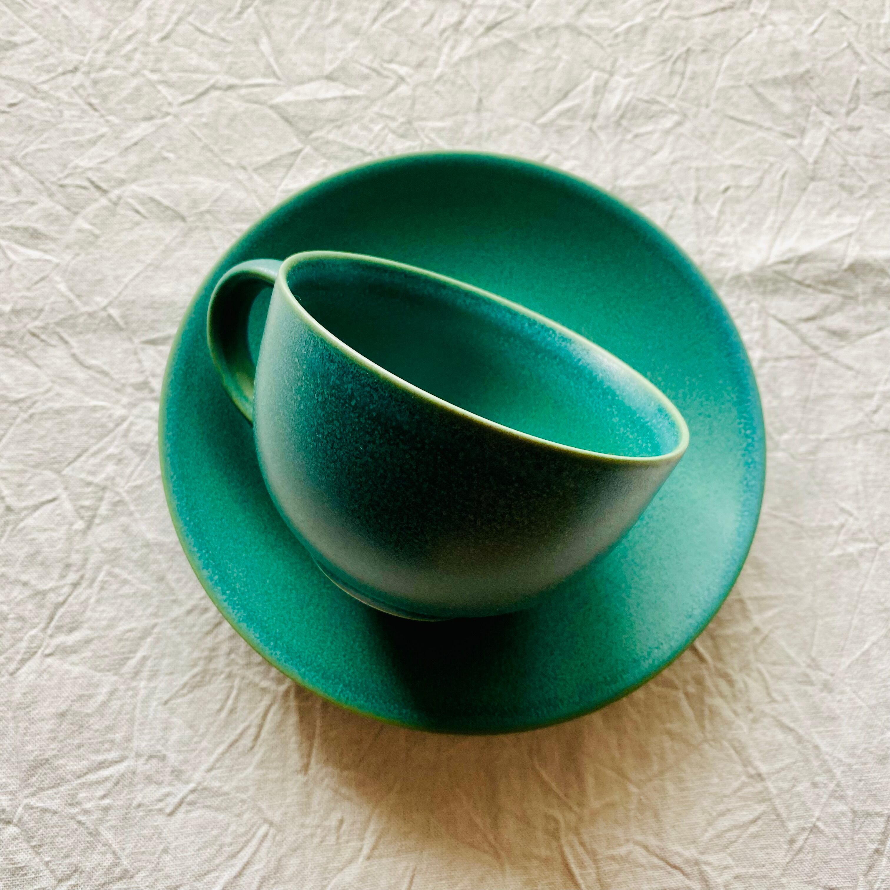 カップとソーサーの淵が少し色が薄く釉薬がかかっており、手焼きのような素朴さを感じます。表面は粒々としている色合いです。