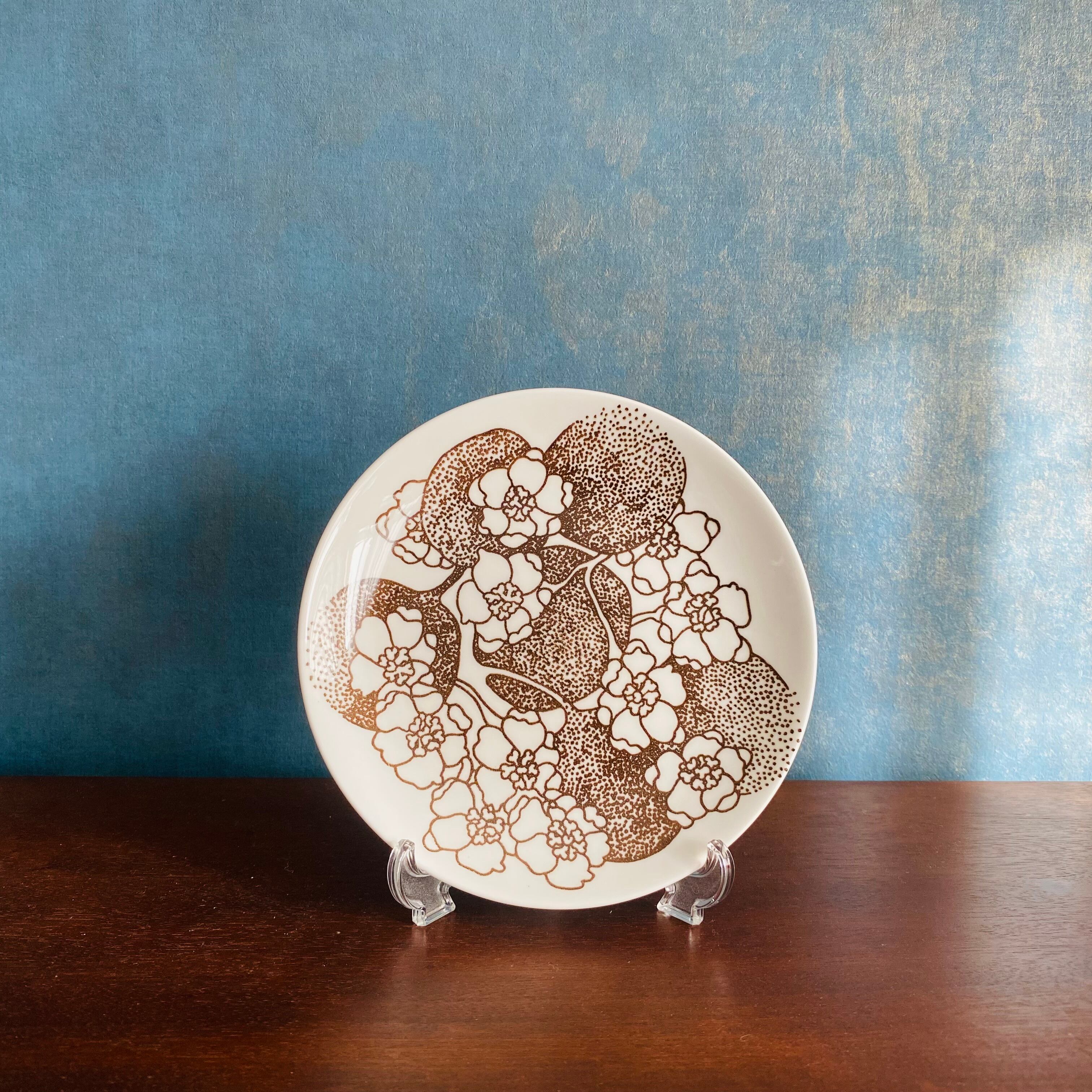 ブラウン一色の点描やかすれで描かれたりんごの実とお花は可愛らしく可憐。落ち着いた色が上に乗せたものを邪魔せず使いやすいです。